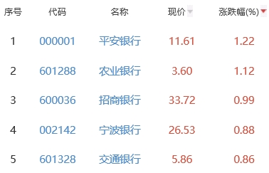 其中,平安银行、农业银行、招商银行、宁波银行、交通银行位列板块涨幅前五位,涨幅分别为1.22%、1.12%、0.99%、0.88%、0.86%。