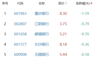重庆银行、江阴银行、邮储银行、长沙银行、无锡银行位列涨幅榜后五位,涨幅分别为-1.19%、-0.79%、-0.76%、-0.36%、-0.18%。