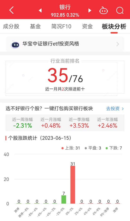 中国经济网北京6月15日讯今日,银行板块整体涨幅0.32%,其中31只股票上涨,3只股票平盘,7只股票下跌。