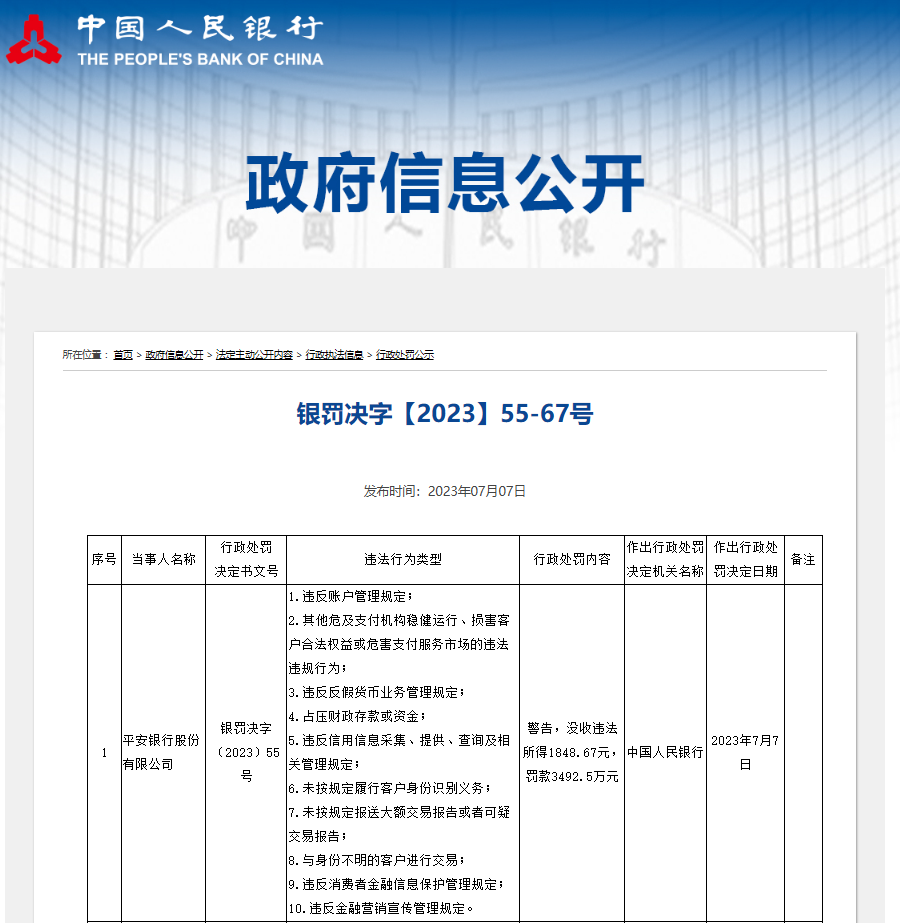 近日,市场星报、安徽财经网记者从中国人民银行行政处罚公示中获悉,7月7日,平安银行股份有限公司被曝光存在严重违法行为。因违反账户管理规定、占压财政存款或资金、违反信用信息管理规定等一系列违规行为。被警告,没收违法所得人民币1848.67元并罚款人民币3492.5万元。同时,该公司多个部门及平安银行广州分行共计12名员工分别被警告或罚款,处罚金额在人民币5000元至人民币20万元不等。