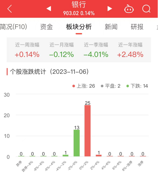 中国经济网北京11月6日讯今日,银行板块整体涨幅0.14%,其中26只股票上涨,2只股票平盘,14只股票下跌。