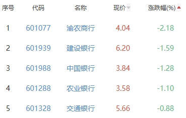 渝农商行、建设银行、中国银行、农业银行、交通银行位列涨幅榜后五位,涨幅分别为-2.18%、-1.59%、-1.28%、-1.10%、-0.88%。