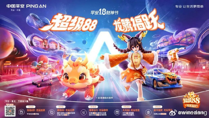 1月8日,平安银行信用卡在开年大考“交卷”,继去年“超级88·LUCK兔U”之后,于今年“平安1.8财神节”期间再次启动“超级88·龙腾福跃”新春活动,携品牌IP“福狸”官安可、AIGC绘制吉祥物“萌龙”亮相,带来覆盖加油出行、跨境出游、餐饮娱乐等重点消费场景的多重福利,传递温暖有AI、喜迎新年的祝福。