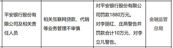 针对以上问题,国家金融监督管理总局对其罚款1880万元。相关责任人李丽红、庄燕被警告并罚款合计10万元,李立凡被警告。