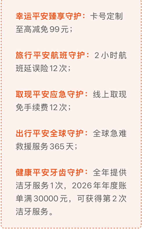 产品秉承平安银行信用卡一贯的“平安”特色,在延续用卡、出行、健康、信用和服务五大基础保障之上,又进一步升级“守护”权益。2026年2月6日—2026年6月30日期间,新户核卡并完成首刷即可享五大守护升级: