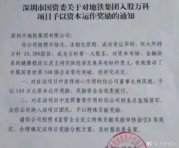 有趣的是,当时为了庆祝这一资本运作盛举,深圳市国资委特别拿出100万元奖金发给深铁集团时任董事长林茂德,另外还对深铁财务总监陈贤军予以特殊贡献奖励。