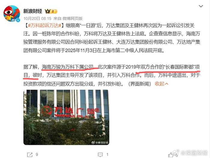 #万科起诉万达#因一桩陈年的合作纠纷,万科将万达及王健林告上法庭,此次案件源于2019年双方合作的“长春国际影都”项目