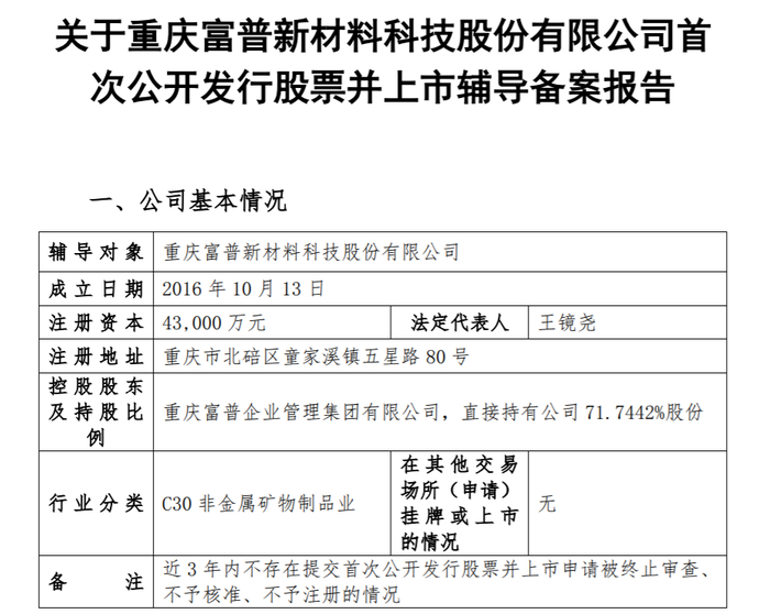 瑞财经 王敏2月24日,重庆富普新材料科技股份有限公司(以下简称“富普新材”)在重庆证监局启动上市辅导,拟A股上市,辅导机构为浙商证券。
