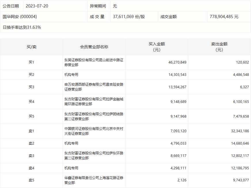 7月20日,国华网安今日涨2.39%,龙虎榜数据显示,上榜营业部席位全天成交2.17亿元,占当日总成交金额比例为27.89%。其中,买入金额为1.17亿元,卖出金额为9994.91万元,合计净买入1737.47万元。