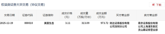 美丽生态今日大宗交易折价成交313.09万股,成交额973.72万元