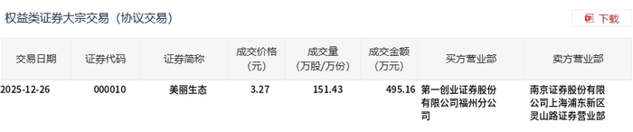 美丽生态今日大宗交易折价成交151.43万股,成交额495.16万元