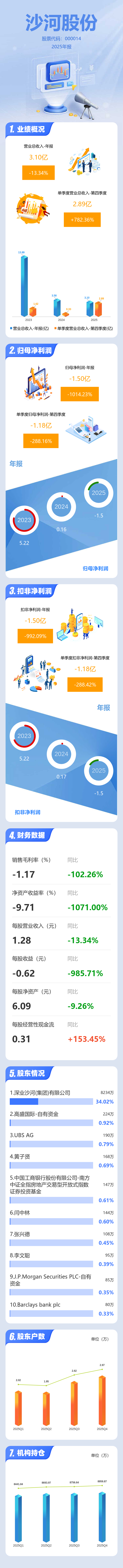 证券之星消息,沙河股份2025年年报显示,当年度公司主营收入3.1亿元,同比下降13.35%;归母净利润-1.5亿元,同比下降1014.24%;扣非净利润-1.5亿元,同比下降992.1%;其中2025年第四季度,公司单季度主营收入2.89亿元,同比上升782.36%;单季度归母净利润-1.18亿元,同比下降288.17%;单季度扣非净利润-1.18亿元,同比下降288.42%;负债率24.99%,财务费用138.02万元,毛利率-1.17%。
