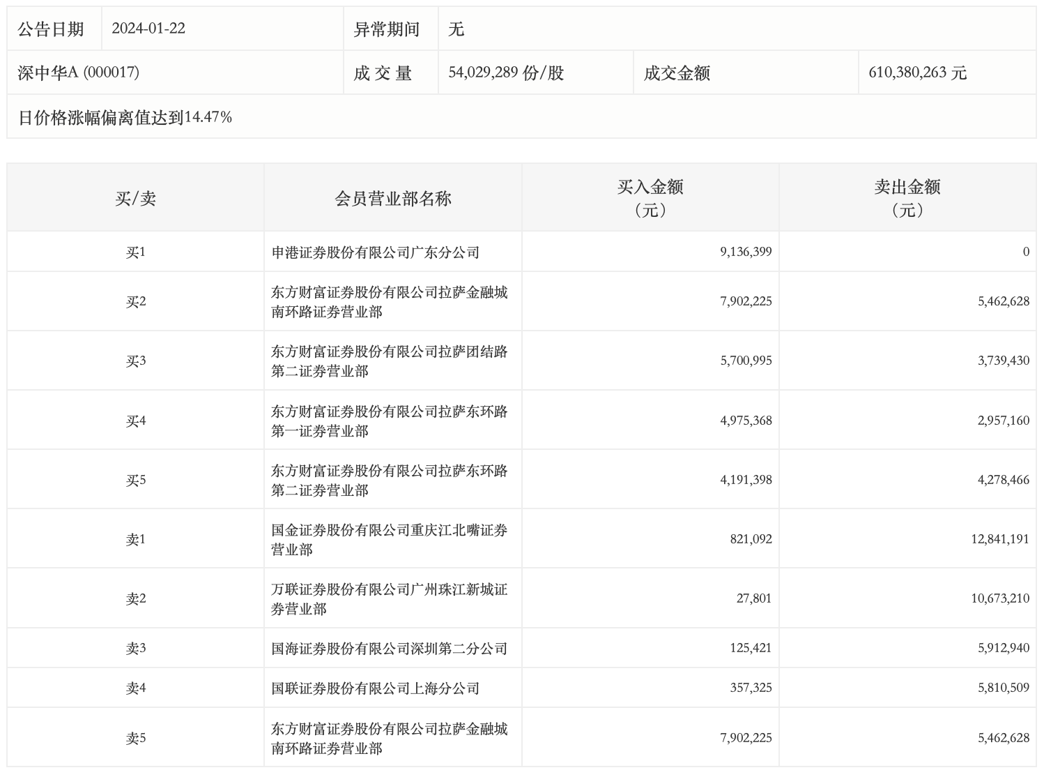 1月22日,深中华A今日涨停,全天换手率达17.83%,振幅达8.82%。龙虎榜数据显示,营业部席位合计净卖出1843.75万元。其中,申港证券广东分公司、东方财富证券拉萨金融城南环路证券营业部分别买入913.64万元、790.22万元;国金证券重庆江北嘴证券营业部、万联证券广州珠江新城证券营业部分别卖出1284.12万元、1067.32万元。
