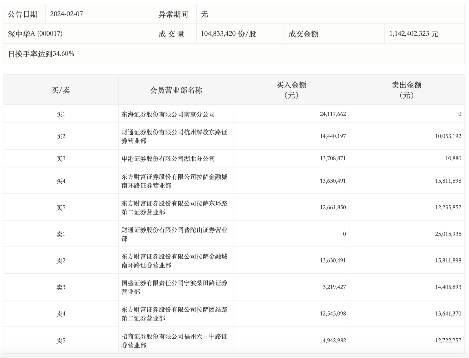 2月7日,深中华A今日跌2.11%,龙虎榜数据显示,上榜营业部席位全天成交2.03亿元,占当日总成交金额比例为17.78%。其中,买入金额为9926.46万元,卖出金额为1.04亿元,合计净卖出463.32万元。