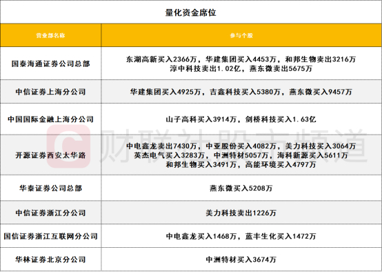 量化资金活跃度较高,剑桥科技获一家量化席位买入1.63亿。燕东微获两家量化席位买入1.46亿,遭一家量化席位卖出5675万,同时获沪股通席位买入1.33亿。