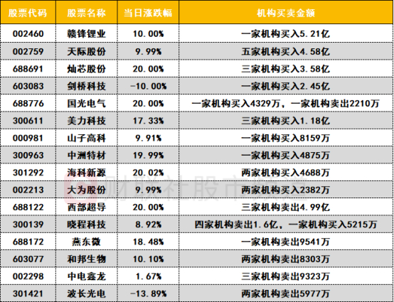 今日龙虎榜机构活跃度较高,买入方面,机构大笔抢筹两只涨停电池股,赣锋锂业获一家机构买入5.21亿,天际股份获五家机构买入4.58亿。