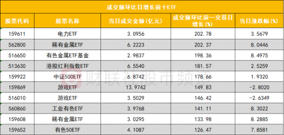 从成交额环比增长前十的ETF来看,电力ETF(159611)成交额环比增长202%位居首位;稀有金属ETF(562800)成交额环比增长202%位居次席。