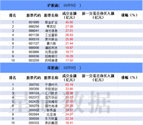 从沪股通前十大成交个股来看,紫金矿业位居首位;寒武纪和海光信息分居二、三位。