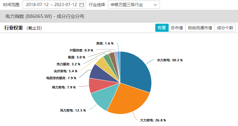 再从行业分布来看,截至7月12日,根据申万三级行业,中证全指电力公用事业指数成分股中,水力发电、火力发电、风力发电、核力发电、电能综合服务行业权重占比位列前五,权重分别为30.2%、26.8%、12.5%、7.9%、7.9%。