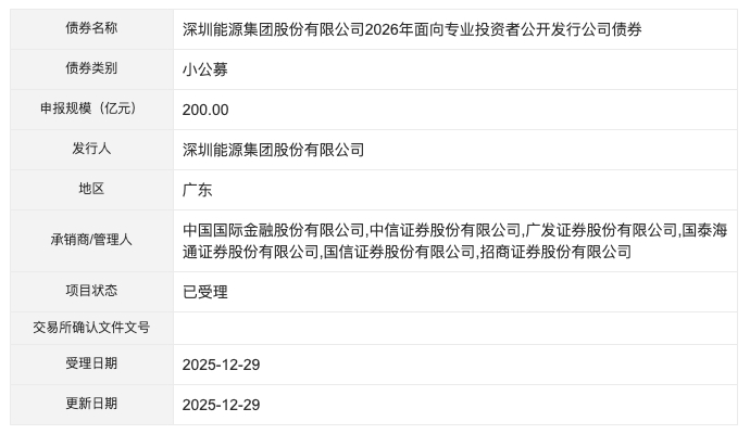 深交所项目进度信息显示,深圳能源集团股份有限公司200亿元小公募债项目状态更新为“已受理”,受理日期为2025年12月29日。募集说明书申报稿显示,本次债券的募集资金在扣除发行费用后,拟用于补充流动资金、投资项目建设、偿还公司债务、股权投资等合法合规用途。