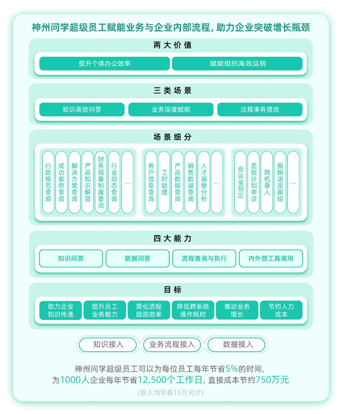 据悉,神州问学超级员工解决方案聚焦企业办公中管理者最关注的“知识孤岛、数据割裂、流程复杂”三大核心问题,通过场景化赋能实现精准破局: