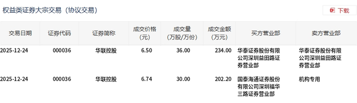 12月24日,华联控股大宗交易成交66万股,成交额436.2万元,占当日总成交额的0.65%,成交均价6.61元,较市场收盘价6.74元折价1.94%,其中最高成交价6.74元,最低成交价6.5元。