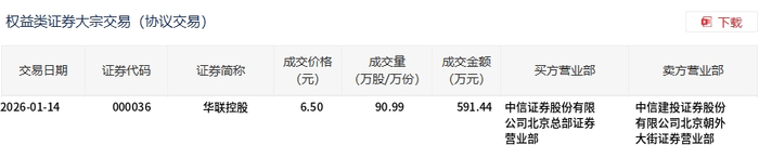 1月14日,华联控股大宗交易成交90.99万股,成交额591.44万元,占当日总成交额的0.61%,成交价6.5元,较市场收盘价6.92元折价6.07%。
