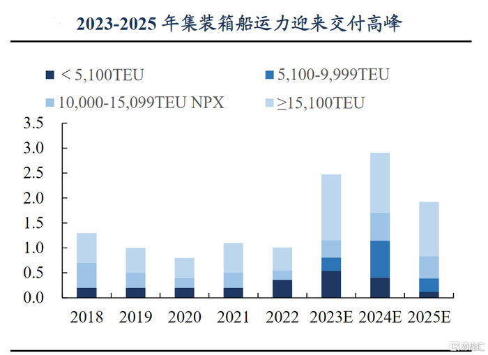 此外,未来两年集运船的交付高峰将会到来,新运力提升会倒逼新集装箱数量增长。根据Alphaliner数据,2023-2025年全球集装箱船交付运力分别达到247、291、192万TEU,远高于过去几年的年均运力增长水平。