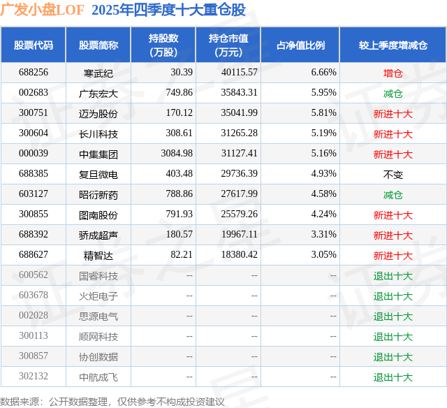 根据2025基金年报公募基金重仓股数据,重仓该股的公募基金共15家,其中持有数量最多的公募基金为广发基金的广发小盘LOF。广发小盘LOF目前规模为57.68亿元,最新净值2.0857(3月4日),较上一交易日上涨0.08%,近一年上涨53.43%。该公募基金现任基金经理为吴远怡 陈韫中。吴远怡在任的基金产品包括:广发创新升级混合,管理时间为2020年9月30日至今,期间收益率为-4.36%;广发科技创新混合A,管理时间为2020年11月18日至今,期间收益率为91.05%;广发价值核心混合A,管理时间为2022年11月1日至今,期间收益率为120.76%;广发成长领航一年持有混合A,管理时间为2023年3月10日至今,期间收益率为152.31%。陈韫中在任的基金产品包括:广发中小盘精选混合A,管理时间为2021年9月28日至今,期间收益率为70.23%;广发成长启航混合A,管理时间为2024年3月19日至今,期间收益率为190.75%;广发科技动力股票,管理时间为2024年5月31日至今,期间收益率为77.43%;