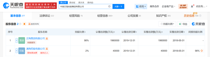 中国泛海控股集团有限公司成立于1988年4月,法定代表人为卢志强,注册资本200亿人民币,经营范围含科技、文化、教育、房地产、基础设施项目及产业的投资,资本经营、资产管理,酒店及物业管理等。股东信息显示,该公司由泛海集团有限公司、通海控股有限公司共同持股。风险信息显示,该公司现存20条被执行人信息,被执行总金额超232亿元,此外,该公司还存在多条限制消费令、终本案件及股权冻结信息。