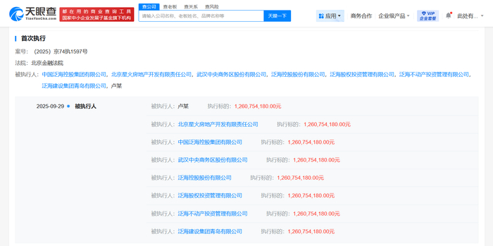 雷达财经讯,天眼查App显示,近日,中国泛海控股集团有限公司、卢志强、武汉中央商务区股份有限公司等新增一则被执行人信息,执行标的12.6亿余元,执行法院为北京金融法院。