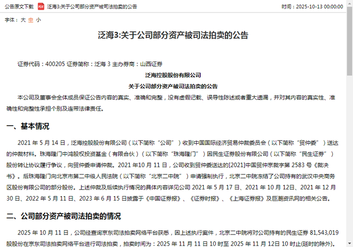 同日,泛海3还发布了关于公司控股股东所持部分公司股份被司法拍卖的进展公告以及关于公司部分资产被司法拍卖的公告。2025年10月11日,泛海3经查询京东司法拍卖网络平台获悉,由于此前的珠海隆门中鸿股权投资基金(有限合伙)(以下简称“珠海隆门”)因民生证券股份有限公司(以下简称“民生证券”)股份转让协议履行争议,向贸仲委申请仲裁。北京二中院将对公司持有的民生证券81,543,019股股份在京东司法拍卖网络平台进行司法拍卖。