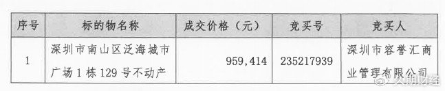2025年12月23日,公司经查询京东司法拍卖网络平台获悉,因在规定时间内无人竞拍,上述司法拍卖事项中位于深圳市南山区泛海城市广场1栋负101号、101-118号、121-128号、201-232号、301-317号共76套不动产的第二次公开司法拍卖已流拍;位于深圳市南山区泛海城市广场1栋129号不动产的第二次公开司法拍卖被拍卖成交,拍卖结果如下: