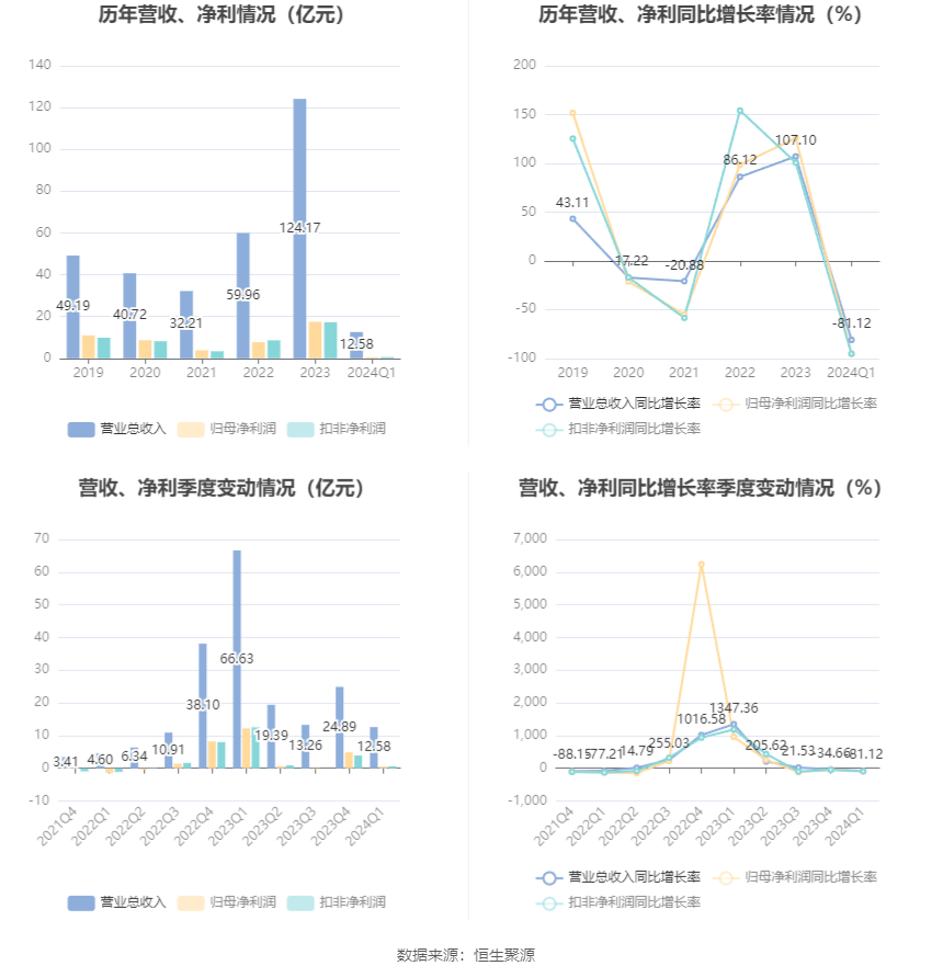 2024年第一季度,公司毛利率为22.63%,同比下降25.19个百分点;净利率为4.55%,较上年同期下降13.79个百分点。