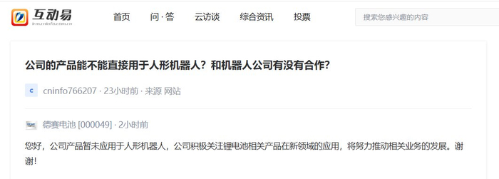 【V观财报丨德赛电池:产品暂未应用于人形机器人】德赛电池11日通过深交所互动易平台回答投资者提问称,公司产品暂未应用于人形机器人,公司积极关注锂电池相关产品在新领域的应用,将努力推动相关业务的发展。(中新经纬APP)