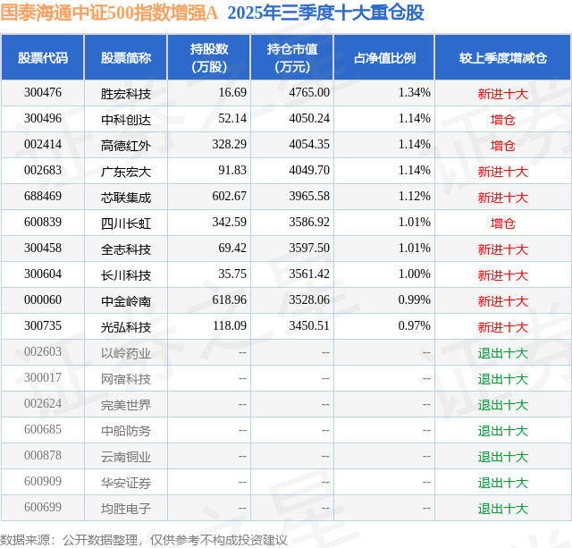 国泰海通中证500指数增强A的前十大重仓股如下: