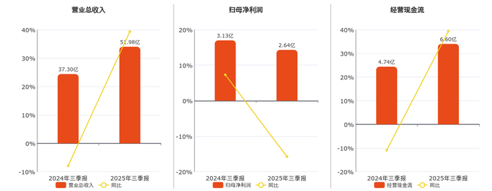 公司营业总收入为51.98亿元,较去年同报告期营业总收入增加13.79亿元,同比较去年同期上涨36.11%。归母净利润为2.64亿元,较去年同报告期归母净利润减少5141.36万元,同比较去年同期下降16.31%。经营活动现金净流入为6.60亿元,较去年同报告期经营活动现金净流入增加1.84亿元,同比较去年同期上涨38.69%。