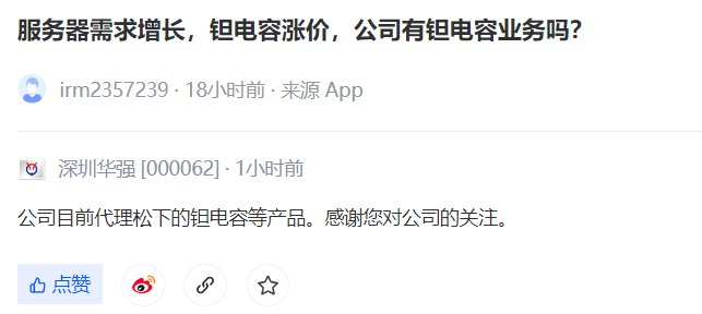 【V观财报|深圳华强:公司目前代理松下的钽电容等产品】针对“公司是否有钽电容业务”等问题,深圳华强10月29日在投资者互动平台表示,公司目前代理松下的钽电容等产品。(
