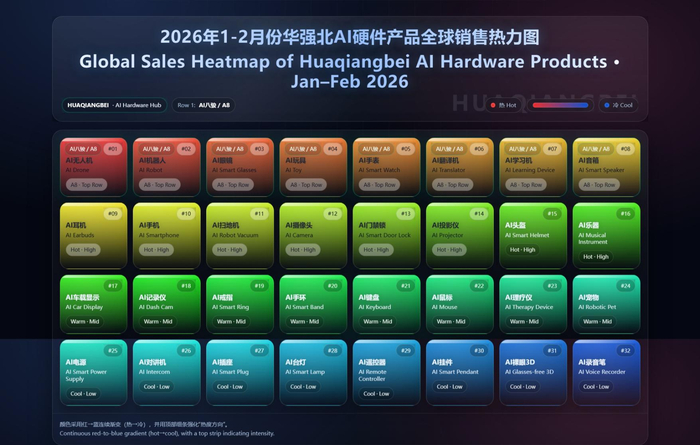 广货行天下,圳品誉四海。深圳产、特别是华强北产的“广货”畅销全球,更是在这个春节掀起了“科技年货”的热销潮。3月3日,深圳华强北通过直播形式,对外发布2026年1-2月AI硬件产品全球销售热力图,直观展现全球AI硬件市场分布、增长态势与未来趋势,为行业企业、市场商户、消费者及投资者提供清晰参考。