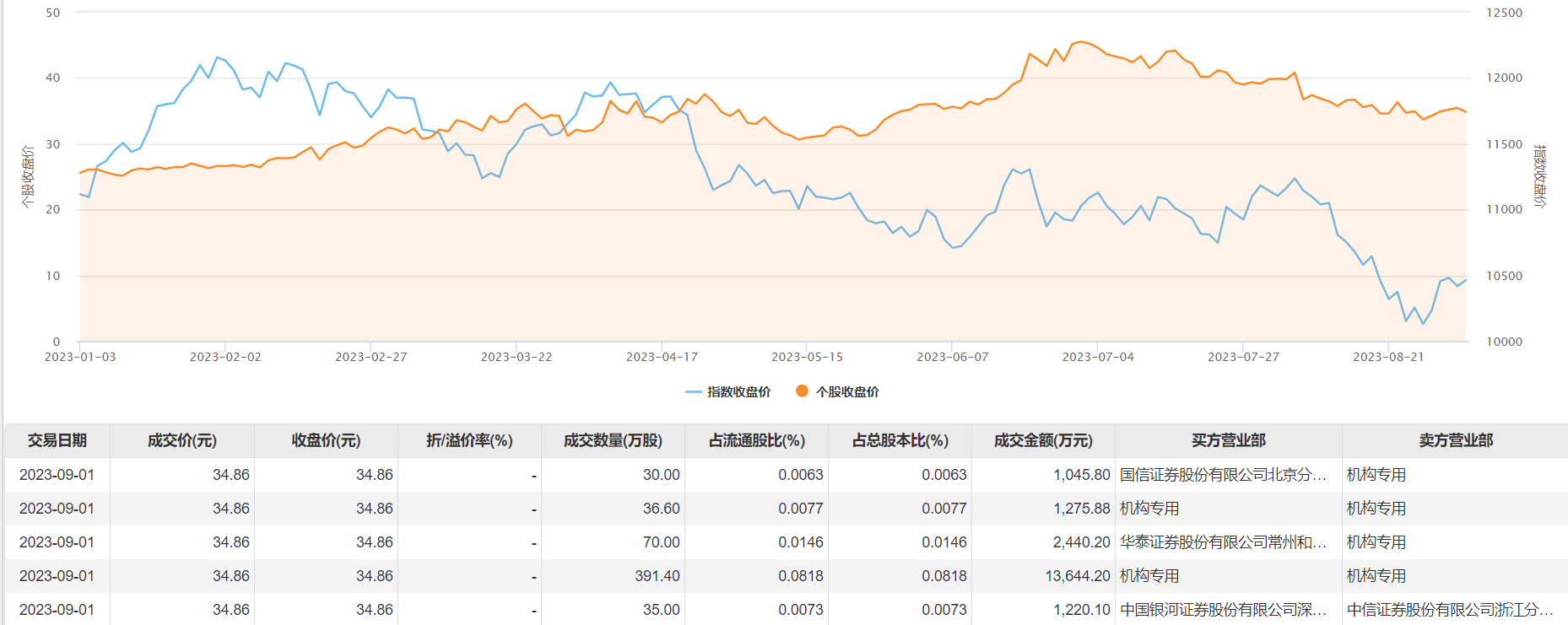 9月1日大宗交易成交563万股,成交额1.96亿元,占当日总成交额的9.23%,成交价34.86元,较市场收盘价34.86元持平。
