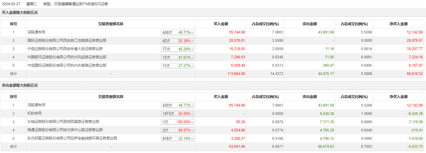 中兴通讯2月27日涨停,龙虎榜数据显示,上榜营业部席位全天成交19.09亿元,占当日总成交金额比例为24.2%。其中,买入金额为12.18亿元,卖出金额为6.91亿元,合计净买入5.26亿元。