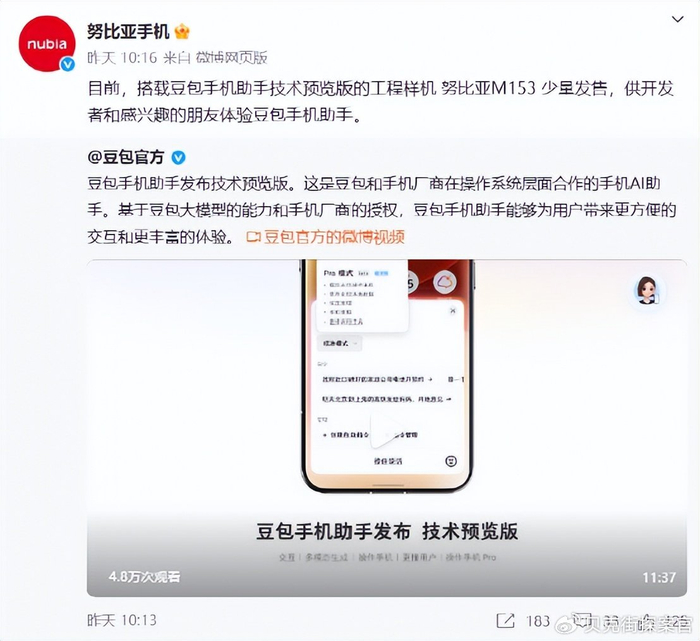 从行业层面看,手机作为核心载体,为大模型开拓最广阔的应用落地场景与商业变现之路。目前开发者和科技爱好者已经可以在豆包与中兴合作的工程样机nubia M153上,体验豆包手机助手的技术预览版本。目前该版本已面向开发者和科技爱好者少量发售,售价3499元。