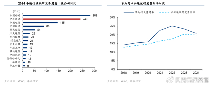 对比上市公司通信板块,公司研发费用明显领先于同行,2024 年国内通讯上市公司研发费用前十五的排名中,公司以 240 亿投入位列第二,仅次于通信板块龙头中国移动。与同样以高水平研发投入著称的华为对比,2018-2024 年公司与华为保持相近研发费用率。