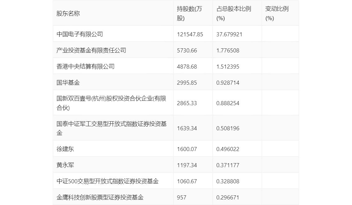 年报显示,2023年年末公司十大流通股东中,新进股东为金鹰科技创新股票型证券投资基金,取代了三季度末的新华人寿保险股份有限公司-分红-团体分红-018L-FH001深。在具体持股比例上,黄永军持股有所上升,香港中央结算有限公司、国泰中证军工交易型开放式指数证券投资基金、中证500交易型开放式指数证券投资基金持股有所下降。