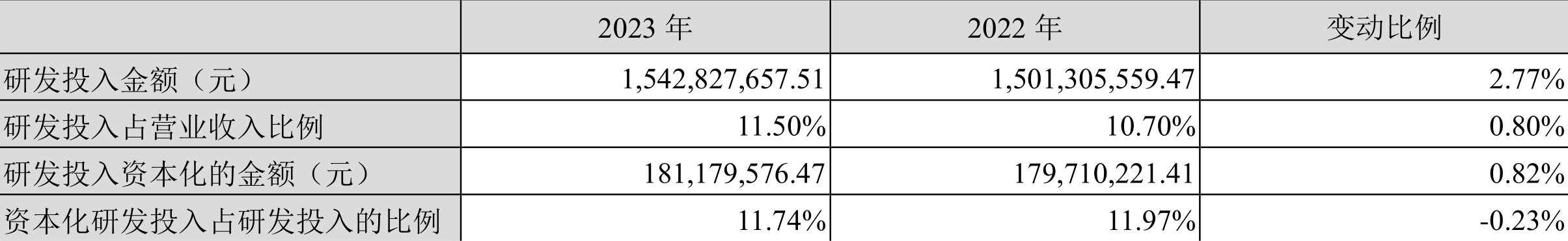 2023年全年,公司研发投入金额为15.43亿元,同比增长2.77%;研发投入占营业收入比例为11.50%,相比上年同期上升0.80个百分点。此外,公司全年研发投入资本化率为11.74%。