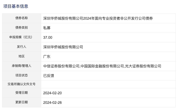 华侨城37亿元私募债项目状态更新为“已反馈”