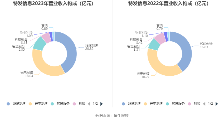 分产品来看,2023年公司主营业务中,线缆制造收入20.82亿元,同比增长23.74%,占营业收入的42.17%;光电制造收入18.04亿元,同比增长10.92%,占营业收入的36.54%;智慧服务收入5.35亿元,同比增长52.13%,占营业收入的10.83%。