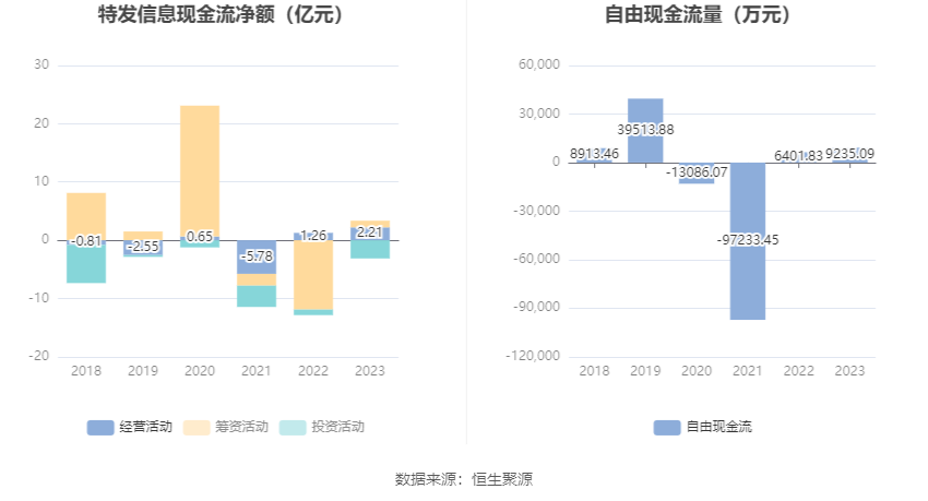 2023年,公司经营活动现金流净额为2.21亿元,同比增长75.97%;筹资活动现金流净额1.14亿元,同比增加13.05亿元;投资活动现金流净额-3.13亿元,上年同期为-9494.9万元。