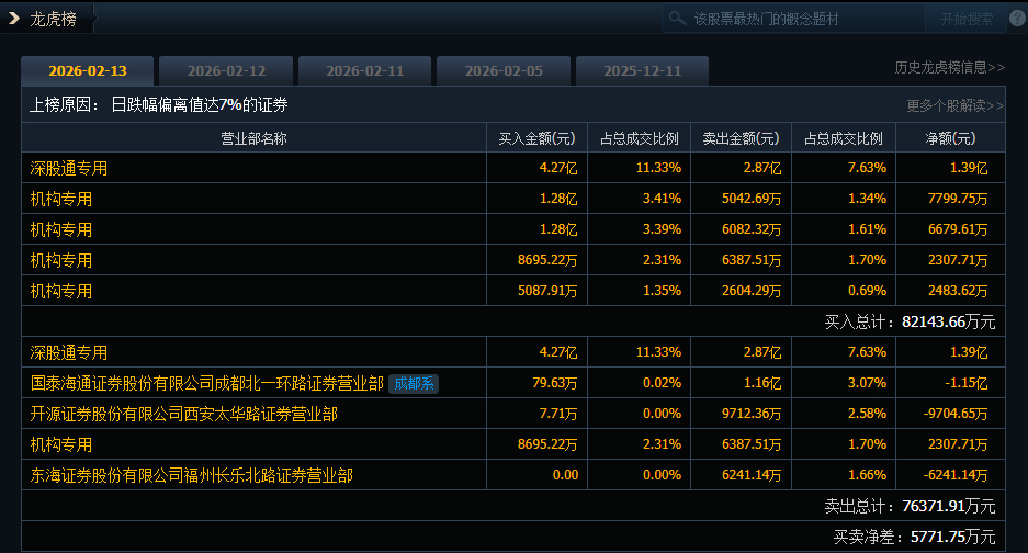 特发信息(000070)今日跌停,成交额37.66亿元,换手率23.06%,盘后龙虎榜数据显示,深股通专用席位买入4.27亿元并卖出2.87亿元,4家机构专用席位净买入1.93亿元。
