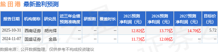 盐田港2025年三季报显示,前三季度公司主营收入6.16亿元,同比上升0.49%;归母净利润10.71亿元,同比上升6.66%;扣非净利润10.71亿元,同比上升6.83%;其中2025年第三季度,公司单季度主营收入2.28亿元,同比上升10.29%;单季度归母净利润4.18亿元,同比上升10.97%;单季度扣非净利润4.17亿元,同比上升11.28%;负债率18.42%,投资收益10.33亿元,财务费用-2850.03万元,毛利率29.81%。